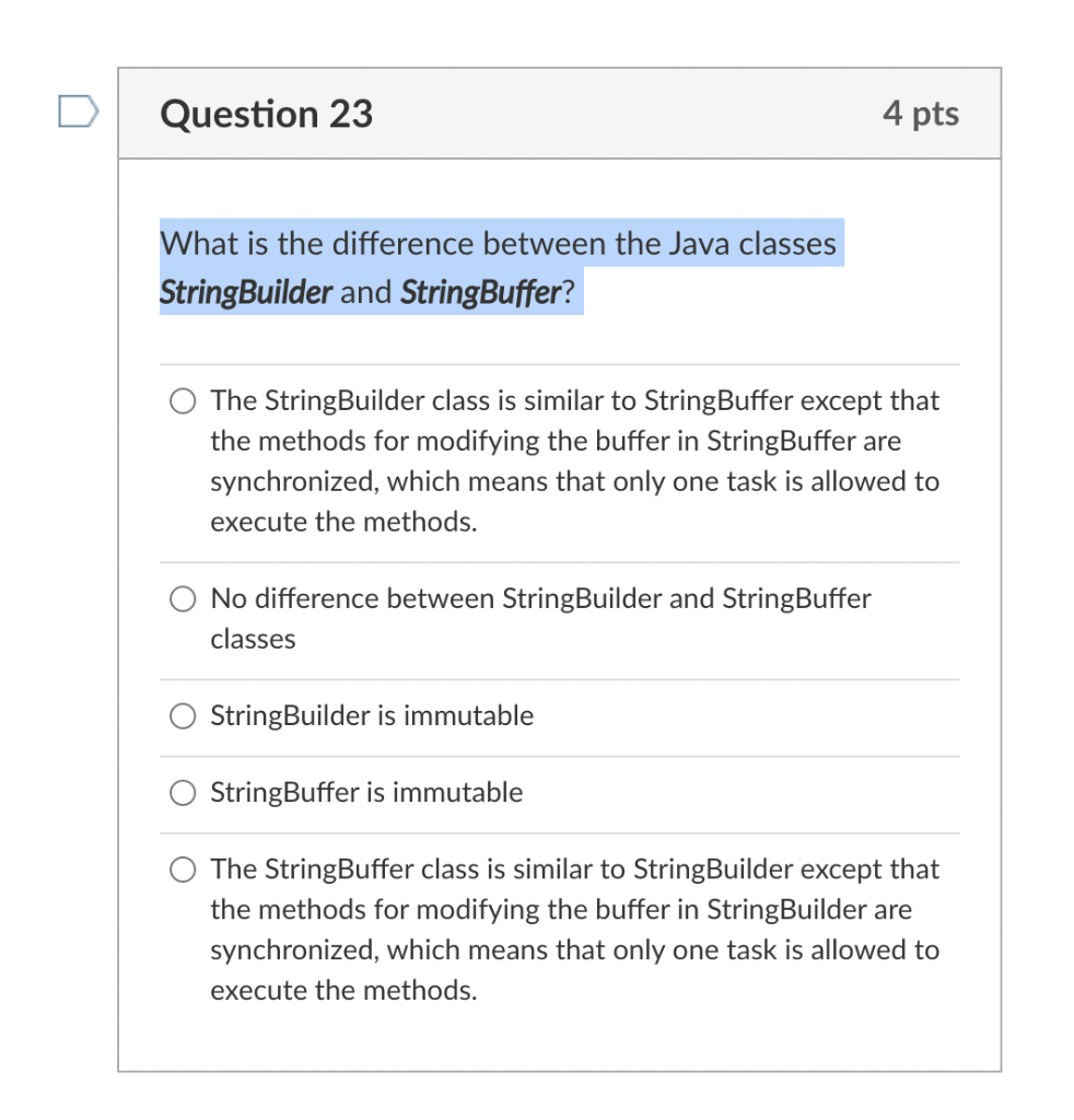 Solved Question 23 4 pts What is the difference between the What Is String Builder Class Web a mutable sequence of characters. Stringbuilder class is a part of java.lang package and was introduced in. Web stringbuilder in java is a class used to create a mutable, or in other words, a modifiable succession of characters. Web stringbuilder (charsequence seq): Web java stringbuilder class is used to create mutable (modifiable) string. This class provides an api compatible. What Is String Builder Class.